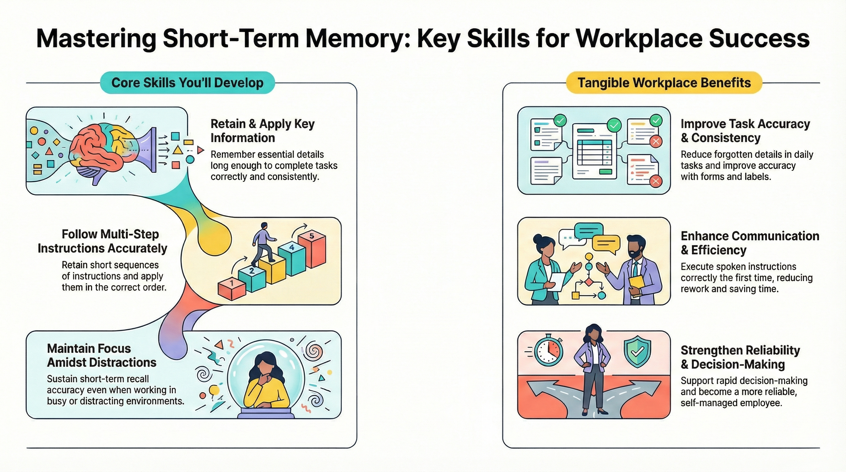 Short-Term Memory focuses on immediate recall and temporary storage of information. This skill supports learning, instruction-following, and rapid response accuracy.